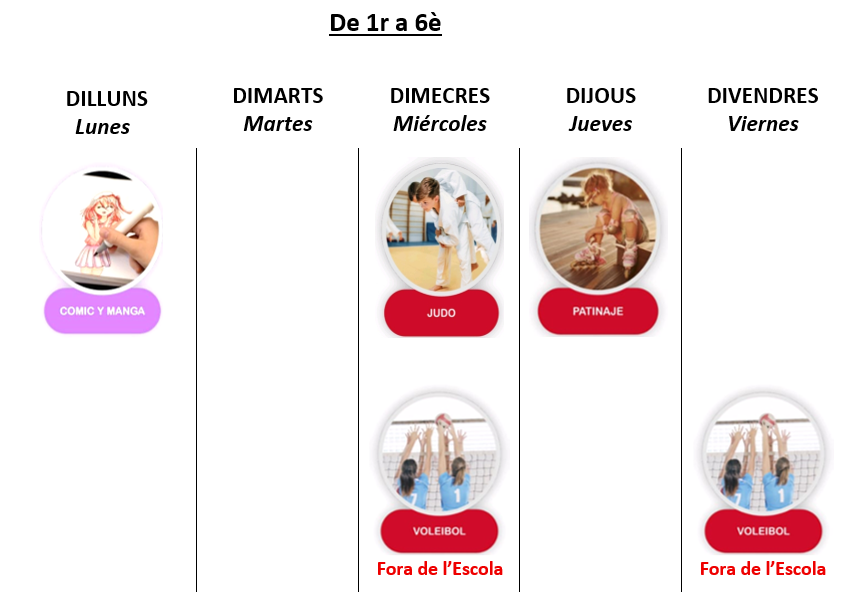 Totes elles es duen a terme a la mateixa Escola de 16:30 a 17:30, excepte Voleibol que es desenvolupa al Poliesportiu la Marina i es realitza de 16:30 a 18:00